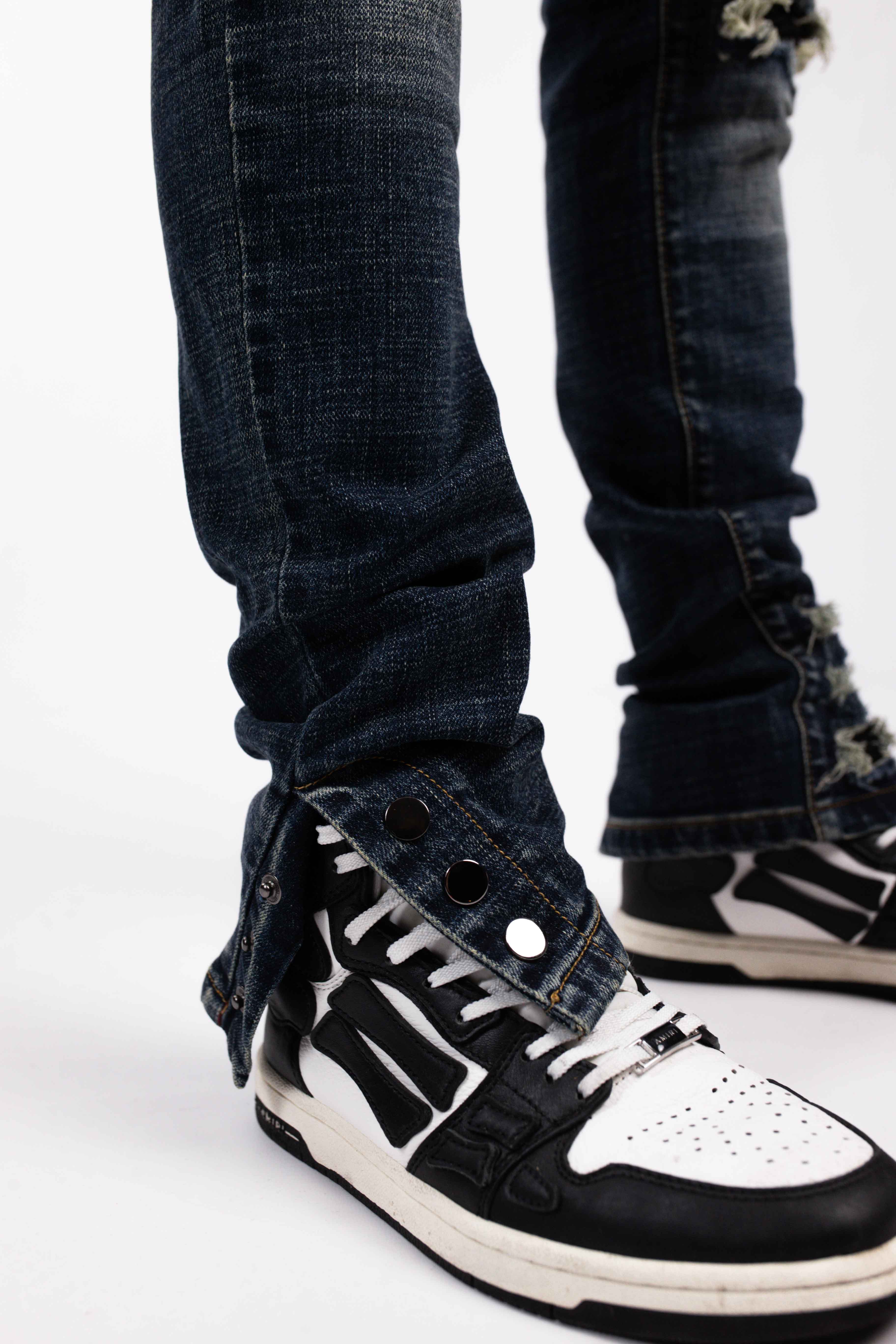 The NC distressed italian stretch denim. Featuring distressed 3 black patches on the front. Classic 5 pocket model.